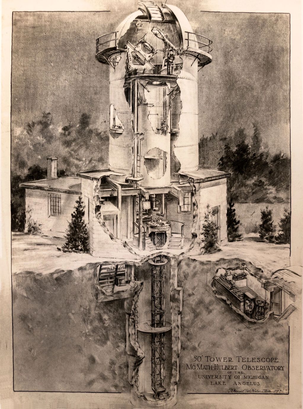 Russell Porter cut-away drawing of Tower Two of the McMath-Hulbert Observatory. Signed and dated Dec 1937.
