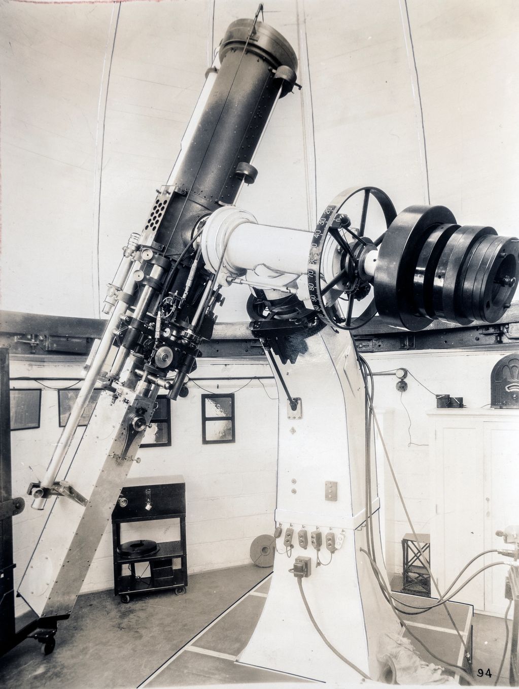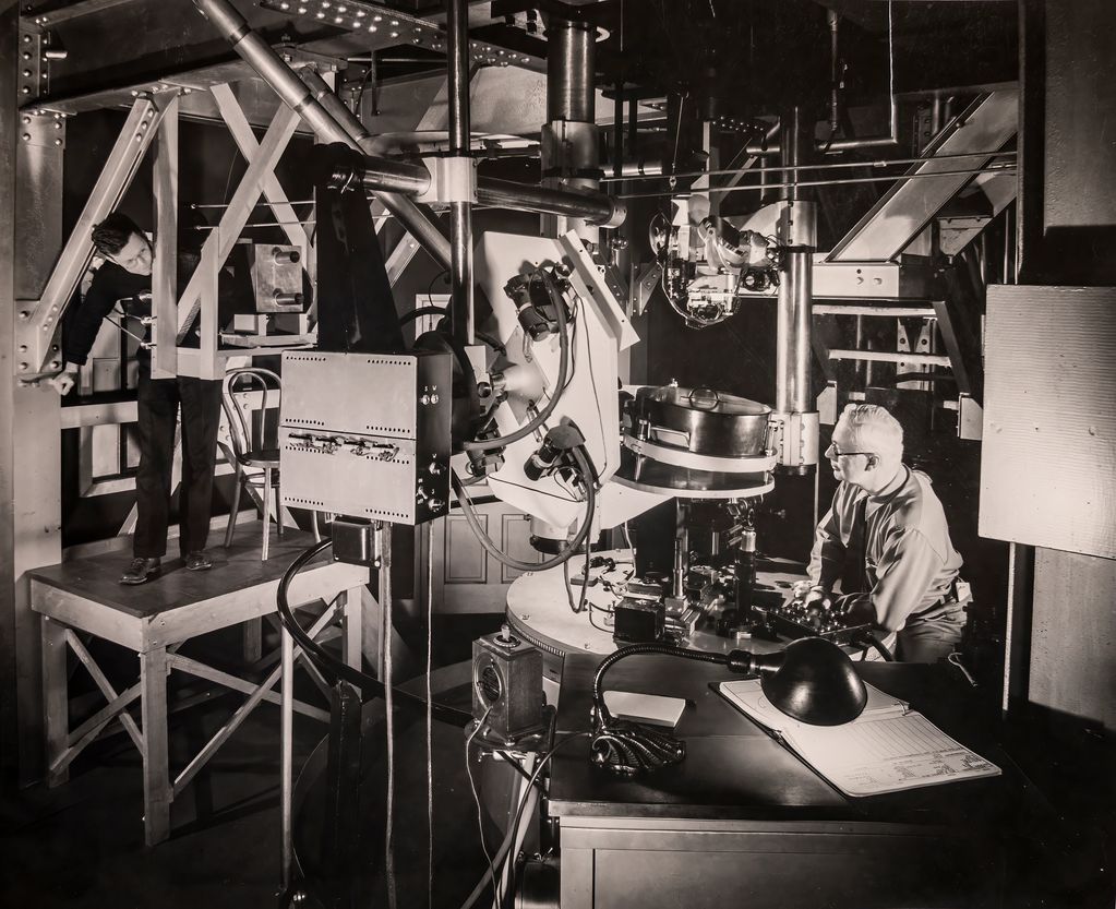 The 10.5" Cassegrain telescope in Tower One with the attached spectroheliokinematograph, which is credited with taking the first motion pictures of solar prominences. About 1930.
